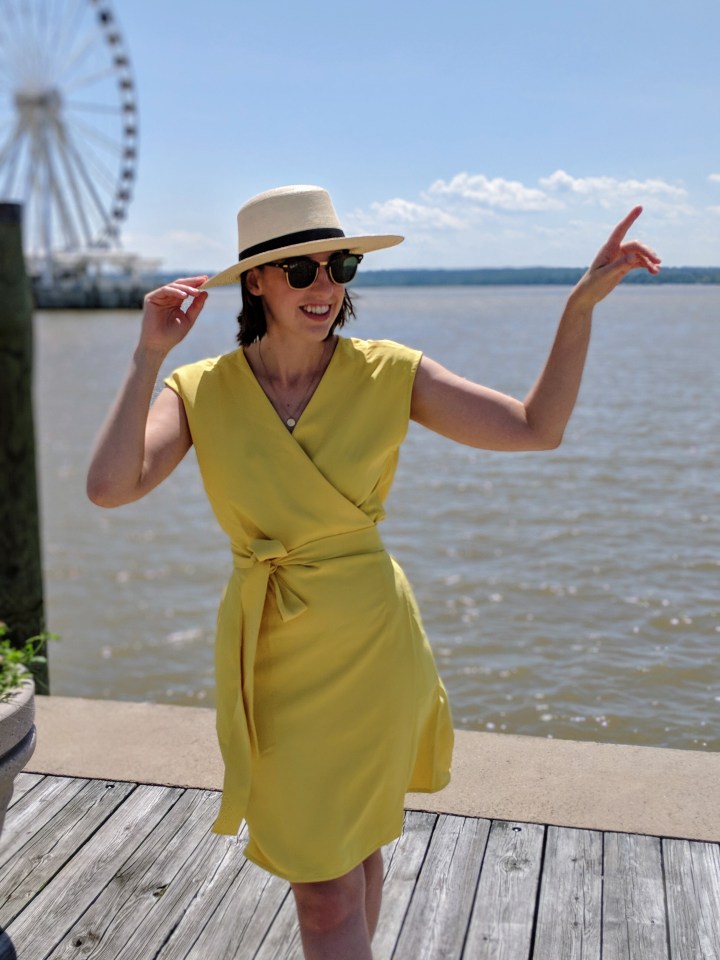 I’m the kind of person who normally needs to read every single review of something before I buy it, but because the wrap dresses are so new, there really weren’t that many reviews out there, and besides the picture of the model on the Everlane site, there were exactly zero “real-person” photos of the yellow short sleeve mini wrap dress anywhere on the internet. So, in case you, like me, are obsessive about reading reviews before you buy something, I’m going to provide a review of the new Everlane Japanese GoWeave Wrap Short Sleeve Wrap Dress in Yellow.