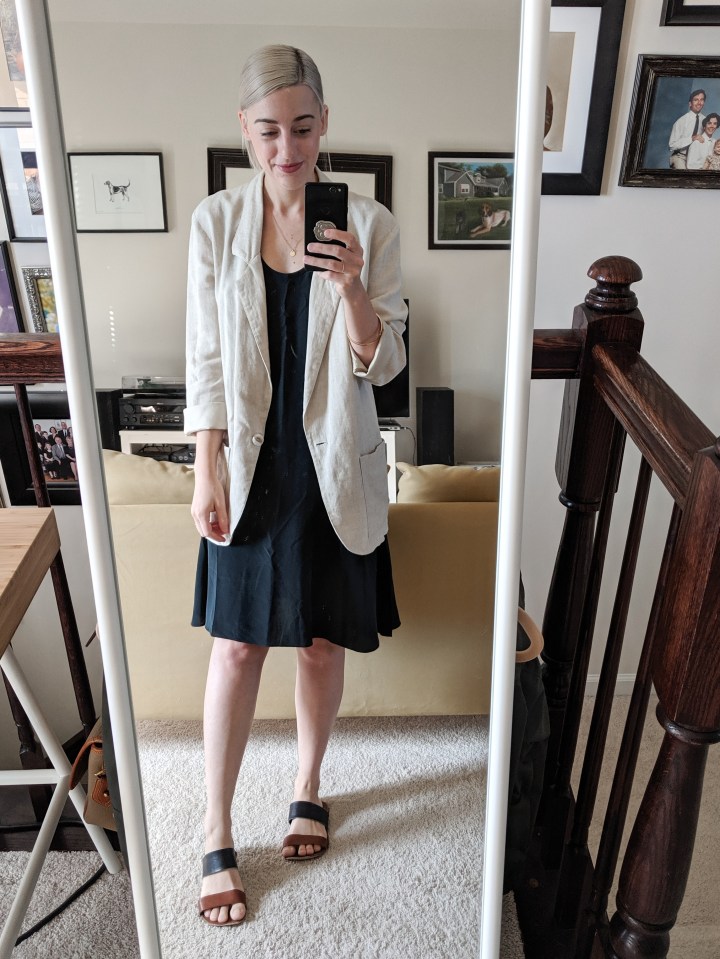 Outfit details: Linen blazer (vintage), Everlane Clean Silk Sleeveless Dress ($120, $84), LOFT leather sandals (old)